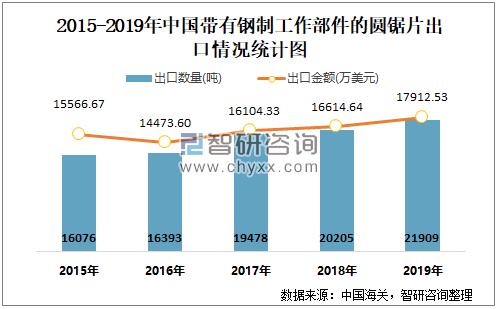 2015-2019年中国带有钢制工作部件的圆锯片出口情况统计图