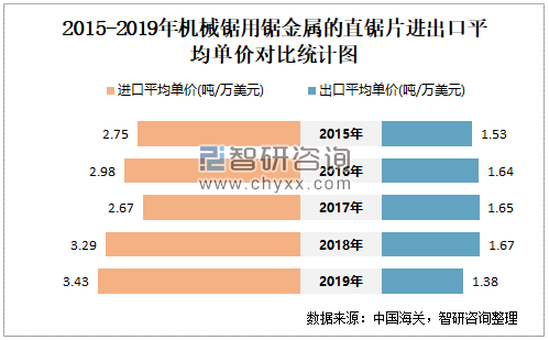 2015-2019年中国机械锯用锯金属的直锯片进出口平均单价对比统计图