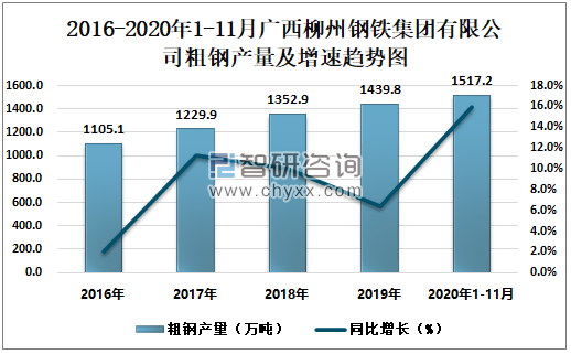 根据冶金工业信息中心数据显示:2020年1-11月广西柳州钢铁集团有限公司钢材产量为1673.5万吨,同比增长20.4%;粗钢产量为1517.2万吨,同比增长16.0%;生铁产量为1341.4万吨,同比增长14.7%。