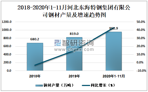2018-2020年1-11月河北东海特钢集团有限公司钢材产量及增速趋势图