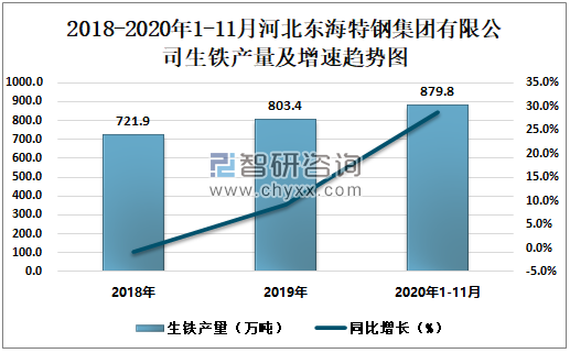 2018-2020年1-11月河北东海特钢集团有限公司生铁产量及增速趋势图