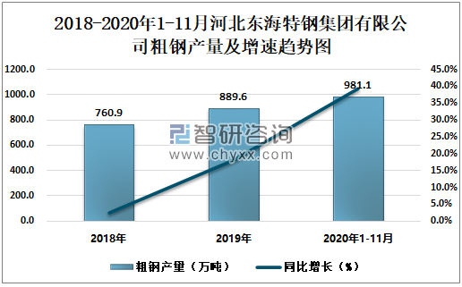 2018-2020年1-11月河北东海特钢集团有限公司粗钢产量及增速趋势图