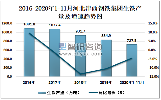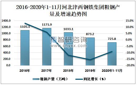 根据冶金工业信息中心数据显示:2020年1-11月河北津西钢铁集团钢材产量为568.7万吨,同比下降22.5%;粗钢产量为725.8万吨,同比下降9.1%;生铁产量为727.5万吨,同比下降4.6%。