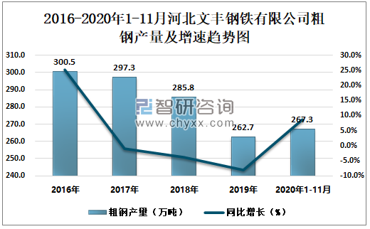 2016-2020年1-11月河北文丰钢铁有限公司粗钢产量及增速趋势图