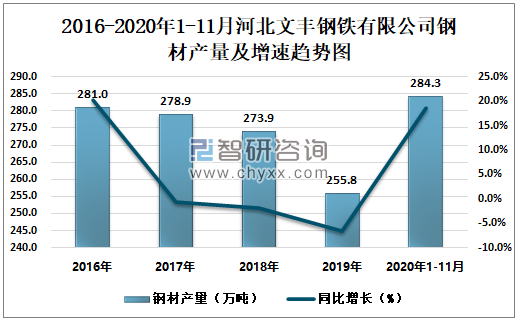 2016-2020年1-11月河北文丰钢铁有限公司钢材产量及增速趋势图