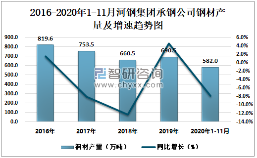2016-2020年1-11月河钢集团承钢公司钢材产量及增速趋势图