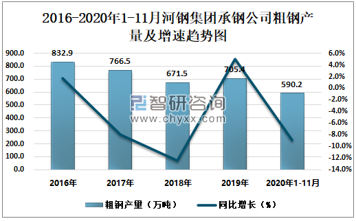 2016-2020年1-11月河钢集团承钢公司粗钢产量及增速趋势图