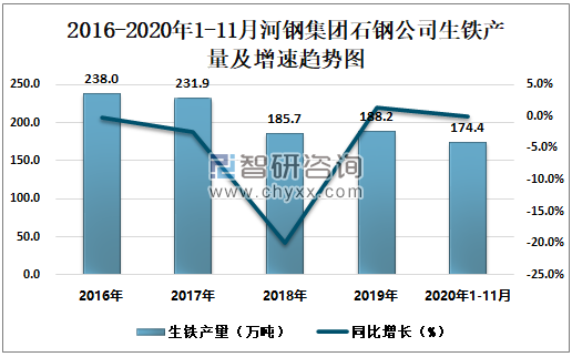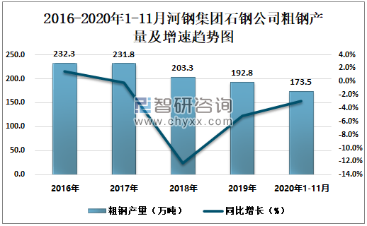 根据冶金工业信息中心数据显示:2020年1-11月河钢集团石钢公司钢材产量为119.5万吨,同比下降9.9%;粗钢产量为173.5万吨,同比下降3.0%;生铁产量为174.4万吨,同比增长0%。