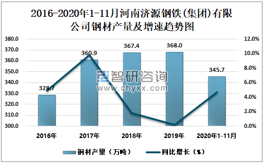 2016-2020年1-11月河南济源钢铁(集团)有限公司钢材产量及增速趋势图