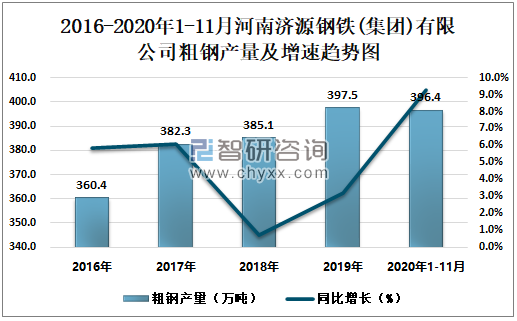2016-2020年1-11月河南济源钢铁(集团)有限公司粗钢产量及增速趋势图