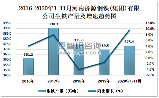 2016-2020年1-11月河南济源钢铁(集团)有限公司生铁产量及增速趋势图