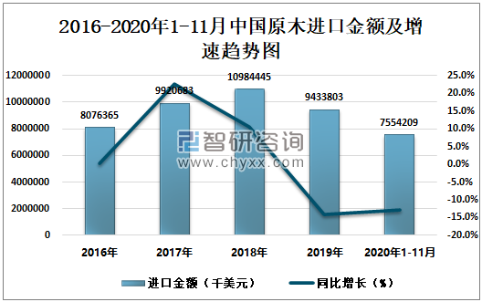2016-2020年1-11月中国原木进口金额及增速趋势图