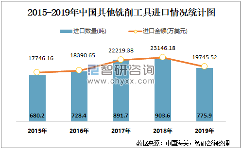 根据中国海关数据显示:2019年1-12月中国其他铣削工具进口数量为775.95吨,进口金额为19745.52万美元;2019年1-12月其他铣削工具出口数量为4373.85吨,出口金额为20250.88万美元。