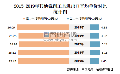 2015-2019年中国其他铣削工具进出口平均单价对比统计图