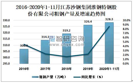 2016-2020年1-11月江苏沙钢集团淮钢特钢股份有限公司粗钢产量及增速趋势图