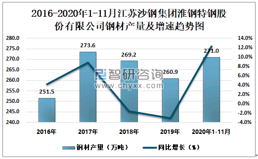 2016-2020年1-11月江苏沙钢集团淮钢特钢股份有限公司钢材产量及增速趋势图
