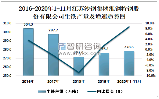 2016-2020年1-11月江苏沙钢集团淮钢特钢股份有限公司生铁产量及增速趋势图