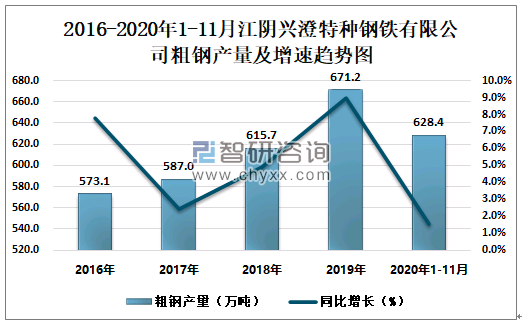 2016-2020年1-11月江阴兴澄特种钢铁有限公司粗钢产量及增速趋势图