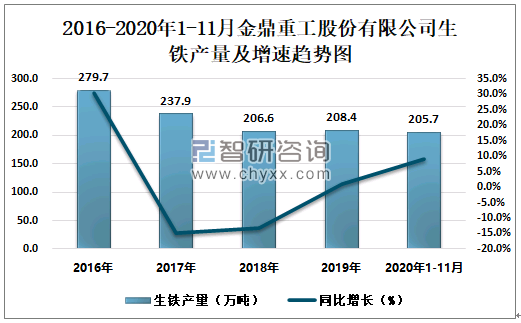 2016-2020年1-11月金鼎重工股份有限公司生铁产量及增速趋势图