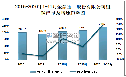 2016-2020年1-11月金鼎重工股份有限公司粗钢产量及增速趋势图
