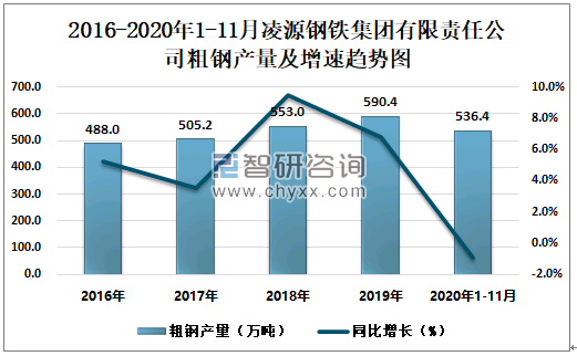 2016-2020年1-11月凌源钢铁集团有限责任公司粗钢产量及增速趋势图