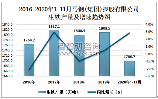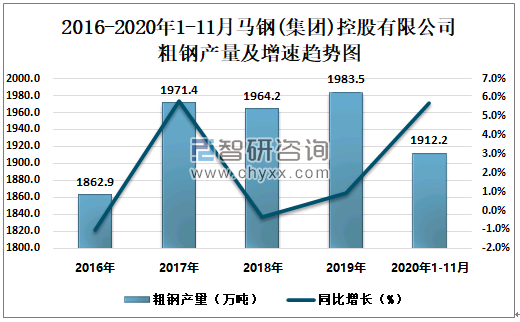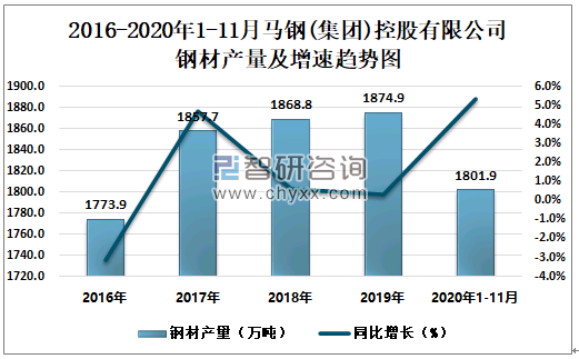 根据冶金工业信息中心数据显示:2020年1-11月马钢(集团)控股有限公司钢材产量为1801.9万吨,同比增长5.3%;粗钢产量为1912.2万吨,同比增长5.7%;生铁产量为1700.7万吨,同比增长2.9%。