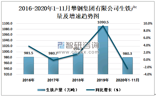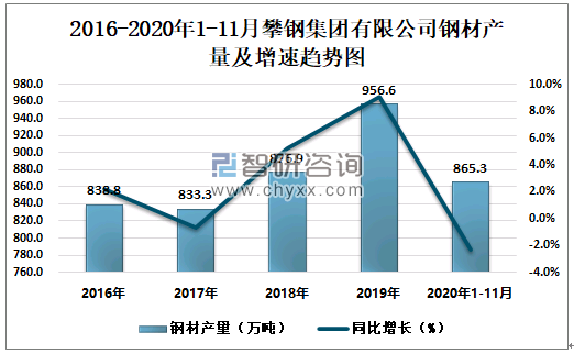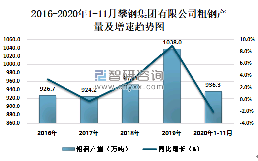 根据冶金工业信息中心数据显示:2020年1-11月攀钢集团有限公司钢材产量为865.3万吨,同比下降2.4%;粗钢产量为936.3万吨,同比下降2.1%;生铁产量为980.3万吨,同比下降2.3%。