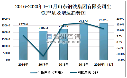 2016-2020年1-11月山东钢铁集团有限公司生铁产量及增速趋势图