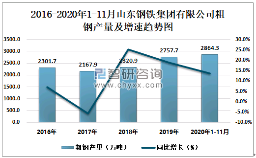 根据冶金工业信息中心数据显示:2020年1-11月山东钢铁集团有限公司钢材产量为2840.9万吨,同比增长16.7%;粗钢产量为2864.3万吨,同比增长13.7%;生铁产量为2672.5万吨,同比增长11.6%。