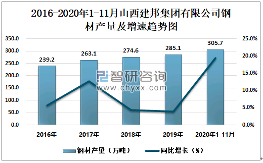 根据冶金工业信息中心数据显示:2020年1-11月山西建邦集团有限公司钢材产量为305.7万吨,同比增长19.4%;粗钢产量为334.2万吨,同比增长18.1%;生铁产量为343.7万吨,同比增长10.8%。