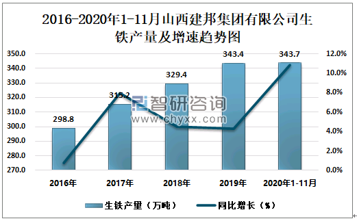 2016-2020年1-11月山西建邦集团有限公司生铁产量及增速趋势图