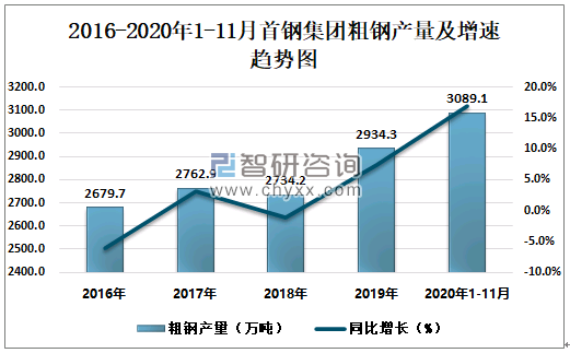 根据冶金工业信息中心数据显示:2020年1-11月首钢集团钢材产量为2899.8万吨,同比增长14.6%;粗钢产量为3089.1万吨,同比增长17.0%;生铁产量为2848.4万吨,同比增长18.6%。