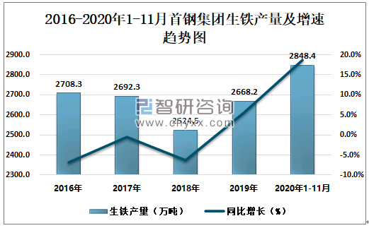 2016-2020年1-11月首钢集团生铁产量及增速趋势图