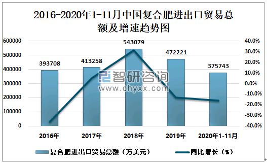 2016-2020年1-11月中国复合肥进出口贸易总额及增速趋势图