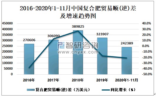 2016-2020年1-11月中国复合肥贸易顺(逆)差及增速趋势图