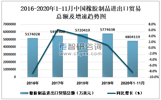 2016-2020年1-11月中国橡胶制品进出口贸易总额及增速趋势图