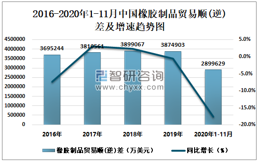 2016-2020年1-11月中国橡胶制品贸易顺(逆)差及增速趋势图