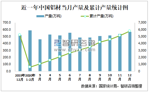 近一年中国铝材当月产量及累计产量统计图