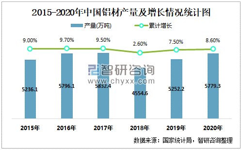 2015-2020年中国铝材产量及增长情况统计图