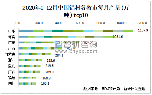 2020年1-12月中国铝材各省市每月产量top10