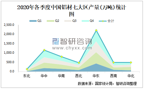 2020年各季度中国铝材七大区产量统计图