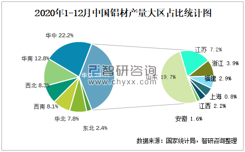 2020年1-12月中国铝材产量大区占比统计图