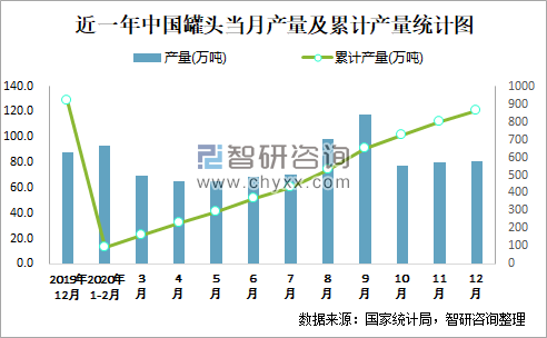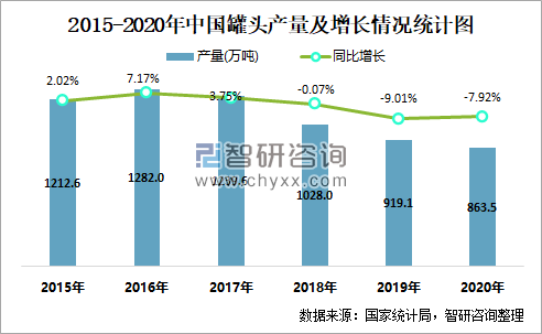 根据国家统计局数据显示:2020年12月中国罐头产量为81.3万吨,同比下降11.15%;2020年1-12月中国罐头累计产量为863.5万吨,同比下降7.92%;2015-2020年中国罐头产量2016年达到最高,此后逐年递减。