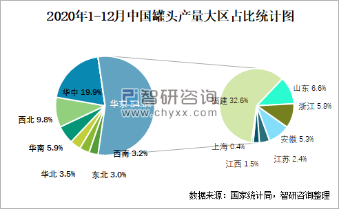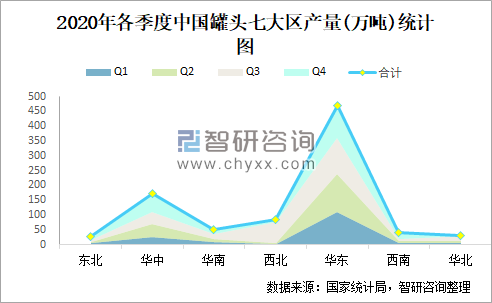 根据国家统计局数据显示:2020年各季度中国罐头主要集中在华东、华中、西北地区生产;2020年1-12月中国罐头产量大区分布不均衡,其中华东地区产量最高,特别是福建省贡献了最多产量;2020年1-12月中国罐头各省产量top1遥遥领先于其他省市,福建、湖南、新疆等省产量最多。