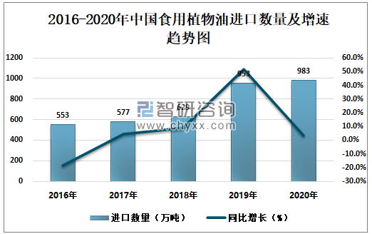 2016-2020年中国食用植物油进口数量及增速趋势图