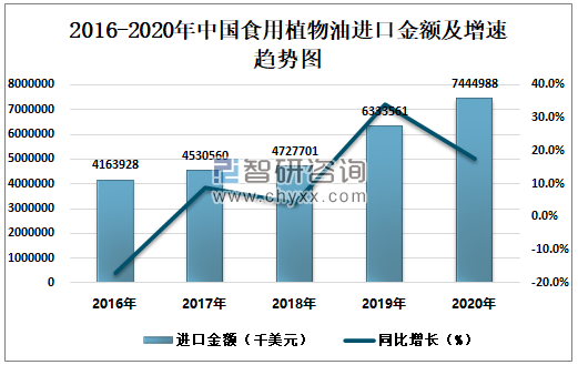2016-2020年中国食用植物油进口金额及增速趋势图