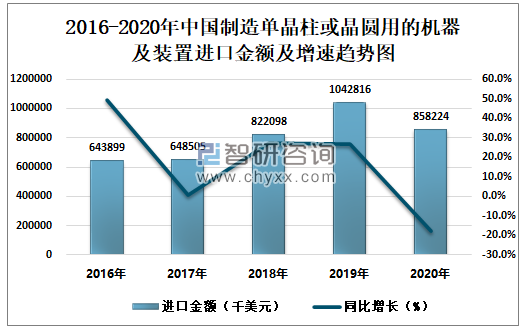 2016-2020年中国制造单晶柱或晶圆用的机器及装置进口金额及增速趋势图