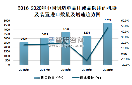 2016-2020年中国制造单晶柱或晶圆用的机器及装置进口数量及增速趋势图