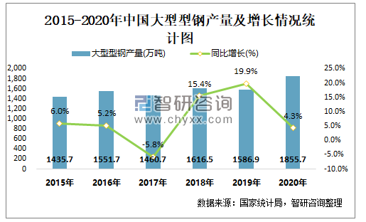 2015-2020年中国大型型钢产量及增长情况统计图