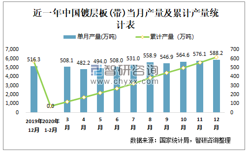 根据国家统计局数据显示:2020年12月中国镀层板(带)产量为588.2万吨,同比增长14.77%;2020年1-12月中国镀层板(带)产量6138.4万吨,同比增长6.83%;2015-2020年中国镀层板(带)产量2020年达到最高值。